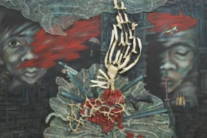 Imelda Cajipe Endaya, Daing Ng Puso (Heart’s Plaint), 1985, oil and collage on canvas and sawali (woven bamboo mat) mounted on plywood, 48″ × 72″. “Central to Cajipe Endaya’s practice is a feminist concern with women’s social roles. Hanging in a corner of the artist’s house is one of her earliest paintings,