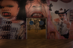 Beneath the paintings’ scabrous and pockmarked facades, one can catch glimpses of facial features, scattered words, and incongruous logos, sprouting from a flower’s stem or inconspicuously planted behind a petal.