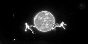 The performers’ hands dictate their body movements, prompting their arms to stretch out behind their backs into a V shape or to contract to compress their bodies into a cylindrical shape. The two figures eventually join one another on the same screen. The video ends with the performers raising their
