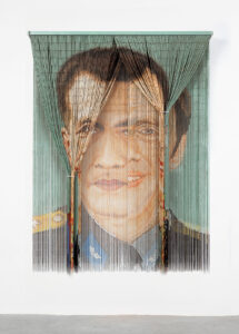 Tuan Andrew Nguyen, Frontier, 2024, bamboo, enamel paint, metal wire, steel, wood, 79 7⁄8 × 60 1⁄4 × 8 1⁄2″. “The bamboo curtain is a common household item in Vietnam and coincidentally a Cold War metaphor for the ideological demarcation between capitalist and Communist states in Asia. Nguyen transformed the