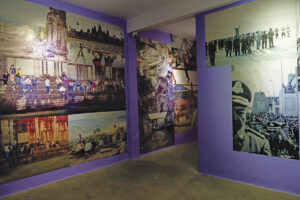 View of “Vandy Rattana: Postcards from Home,” 2025. “On the walls of the exhibition’s front room, Rattana collaged variously sized images capturing a wide span of sites and periods and depicting subjects ranging from tourists swarming in front of the temples at Angkor Wat to tense-faced Khmer Rouge leaders on